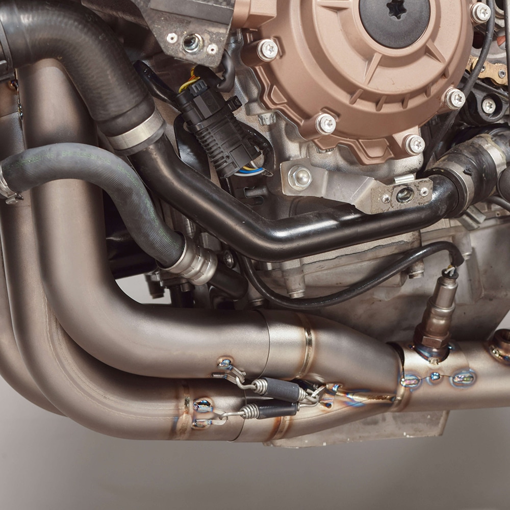 Constructed with a titanium silencer with carbon cap end, catalyst eliminating stainless mid-pipe and stainless racing header. Handcrafted in Italy.